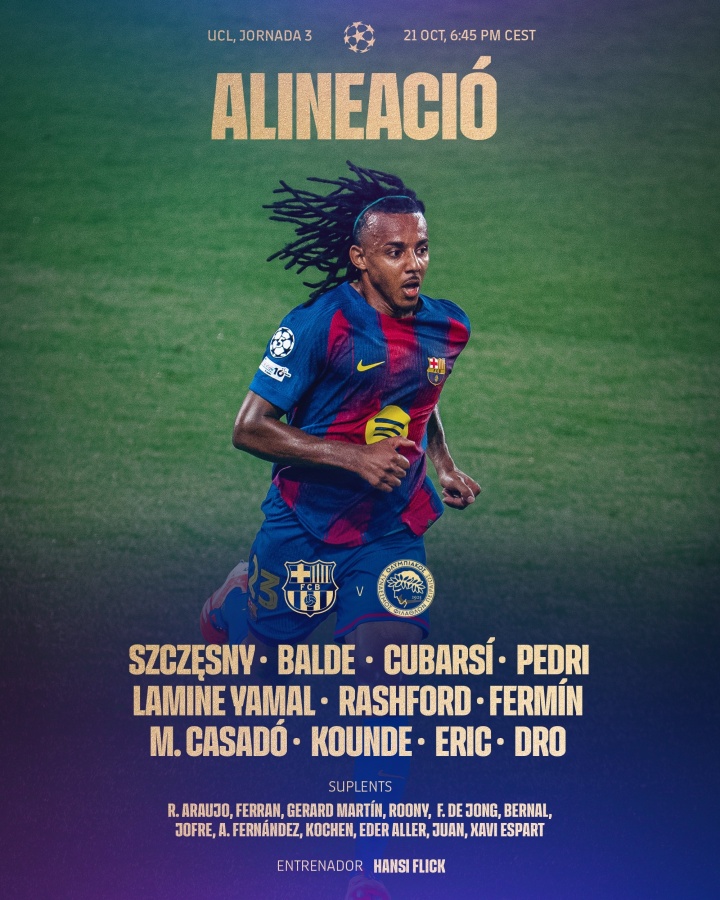 巴萨首发:什琴斯尼、巴尔德、库巴西、佩德里、亚马尔、拉什福德、费尔明、卡萨多、孔德、埃里克·加西亚、德罗
